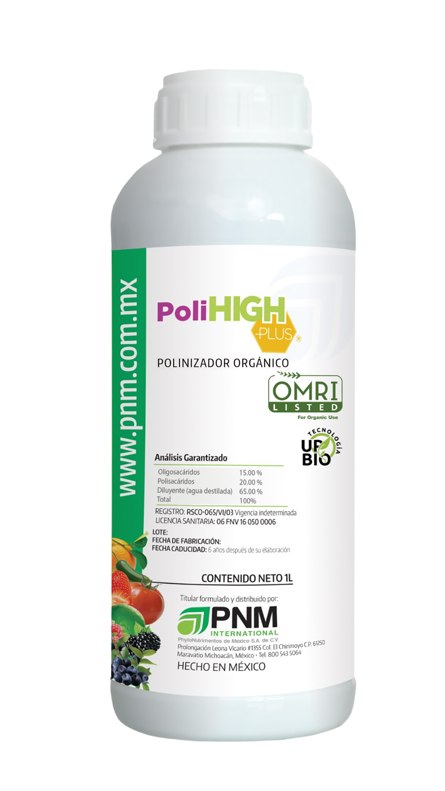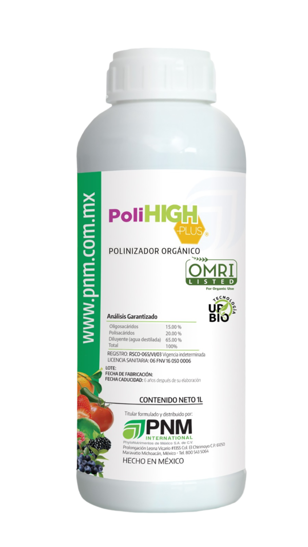 Es un producto innovador único en el mercado, diseñado exclusivamente para incrementar la polinización por abejas y abejorros en forma natural. Poli high plus es un polinizador y atrayente agrícola de origen 100% orgánico con certificación OMRI, el cual fue desarrollado biotecnológicamente para ser utilizado en todo tipo de cultivos, para incrementar la polinización y amarre de flores y frutos de manera natural.